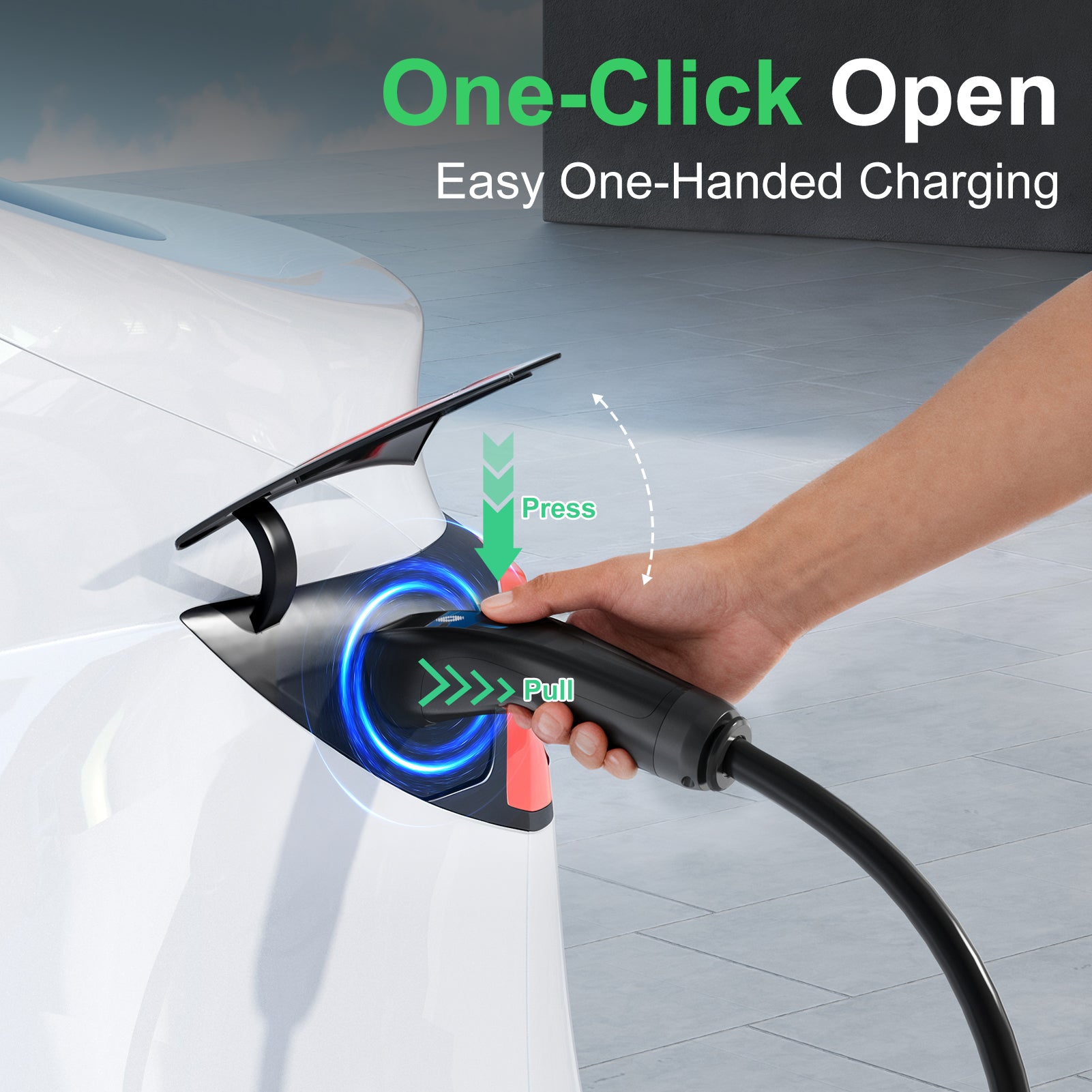 One-Year Warranty & One-Button Charge Port Access - Backed by a one-year warranty, this charger offers durability and reliability. It also features a one-button function on the handle to instantly unlock the charge port, making charging quick and easy.